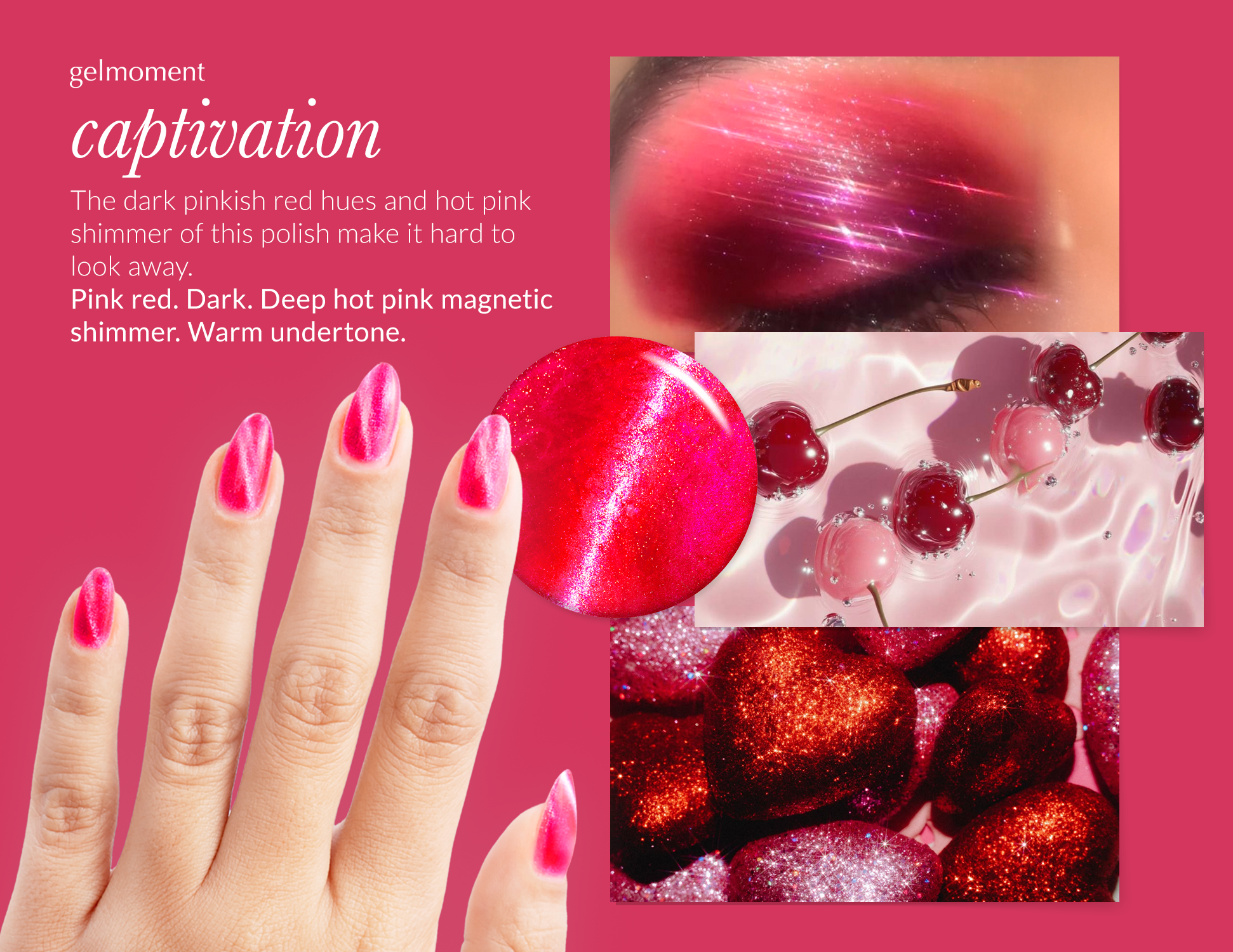 Pink red. Dark. Deep hot pink magnetic shimmer. Opaque. Warm undertone.